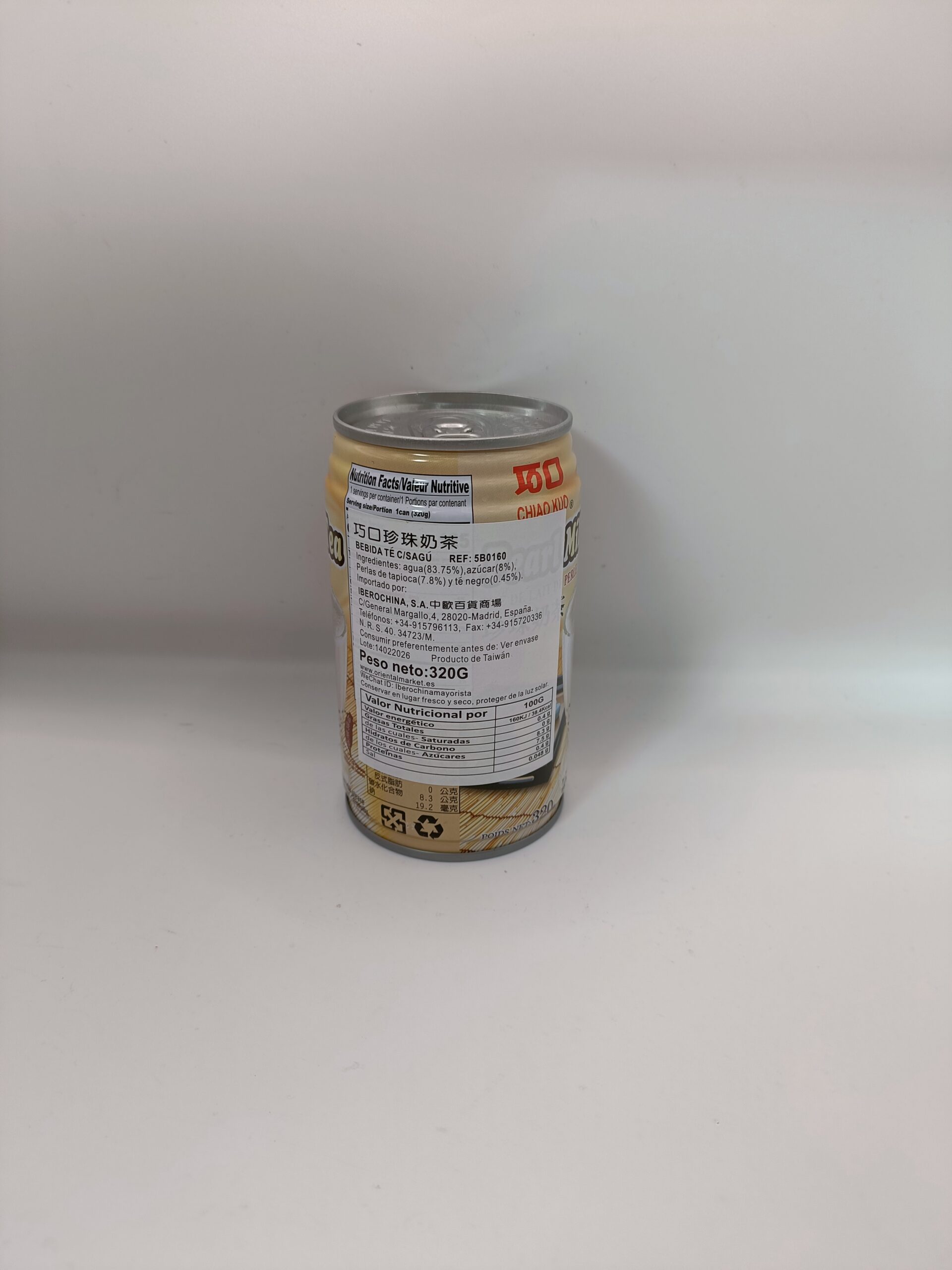 Ingredientes: Agua (83.75%), azúcar (8%), perlas de tapioca (7.8%) y té negro (0.45%).