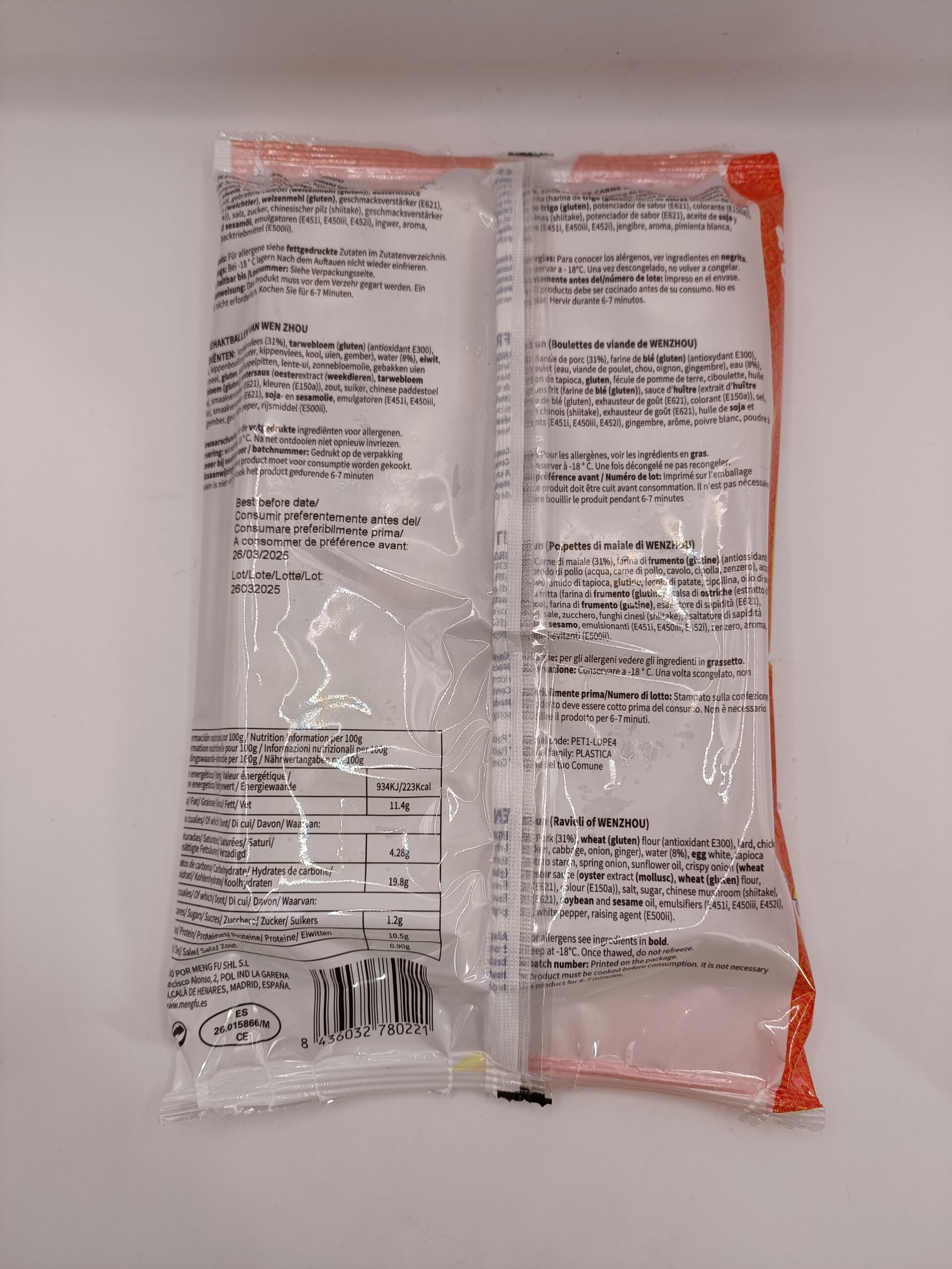 Ingredientes: Carne de cerdo (65%), caldo de pollo (agua, carne de pollo, repollo, cebolla, jengibre), fécula de patata, harina de tapioca, clara de huevo, azúcar, sal, salsa de soja (harina de trigo (gluten)), potenciador de sabor (umami) (E621, E631, E627), potenciador de sabor (E621), jengibre, vino chino (trigo (gluten)), emulgentes (E451i, E450iii, E452i), aroma y pimienta blanca.