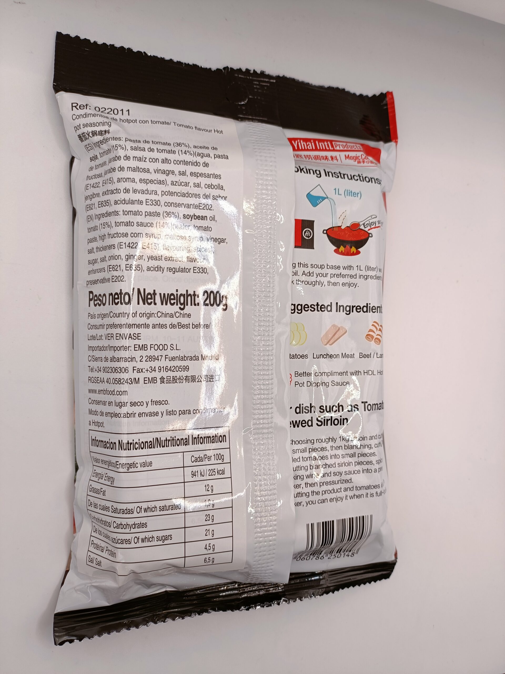 Ingredientes: Pasta de tomate (36%), aceite de soja, tomate (15%), salsa de tomate (14%) (agua, pasta de tomate, jarabe de maíz con alto contenido de fructosa, jarabe de maltosa, vinagre, sal, espesantes (E1422, E415), aroma, especias), azúcar, sal, cebolla, jengibre, extracto de levadura, potenciadores del sabor (E621, E635), acidulante E330, conservante E202